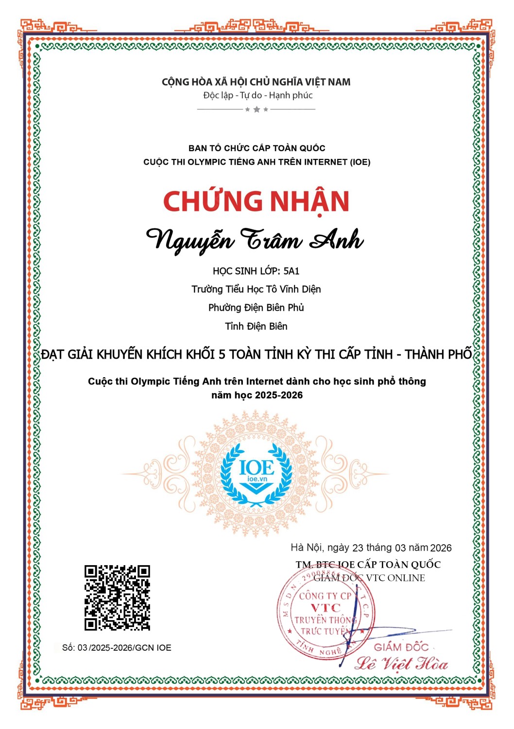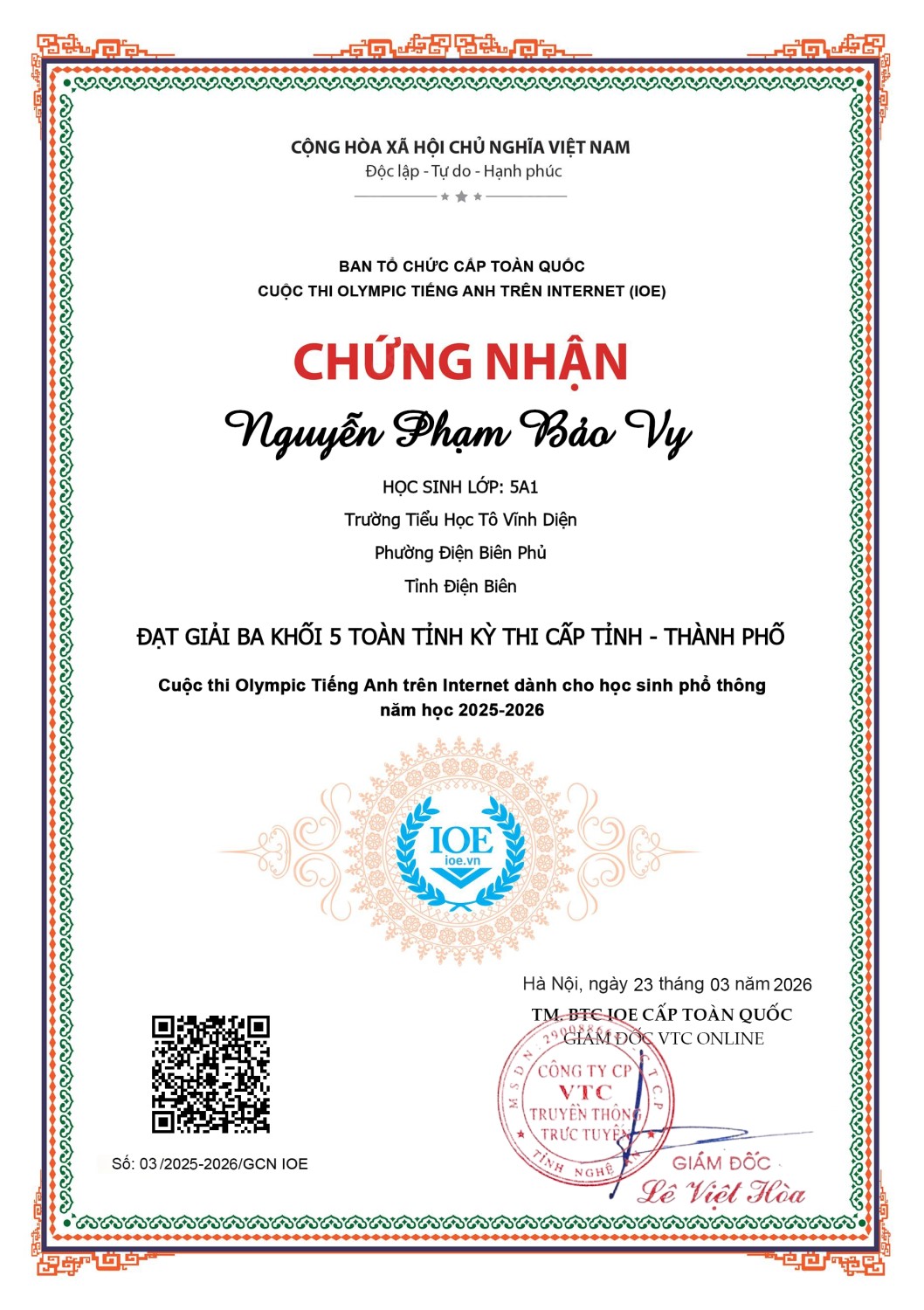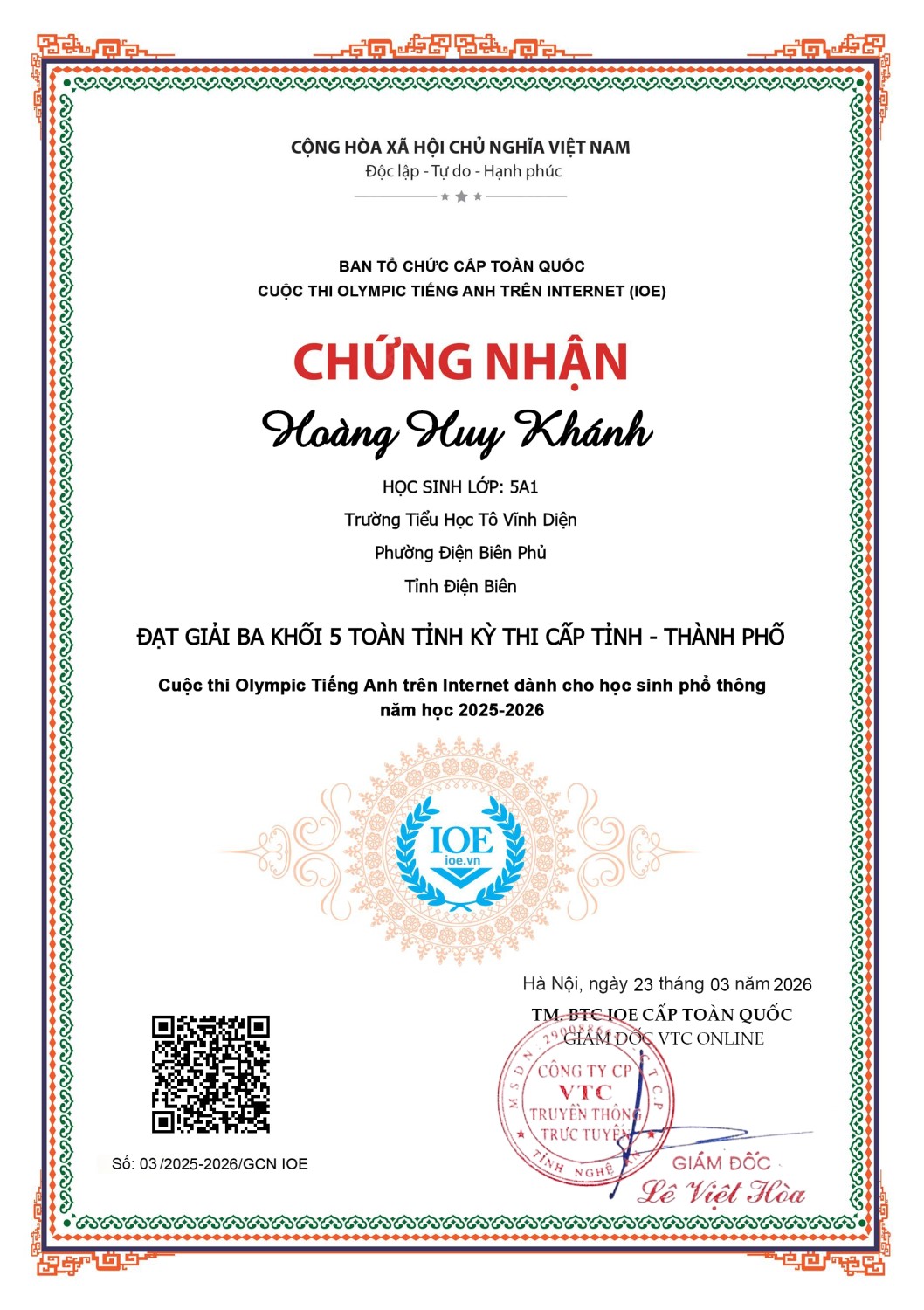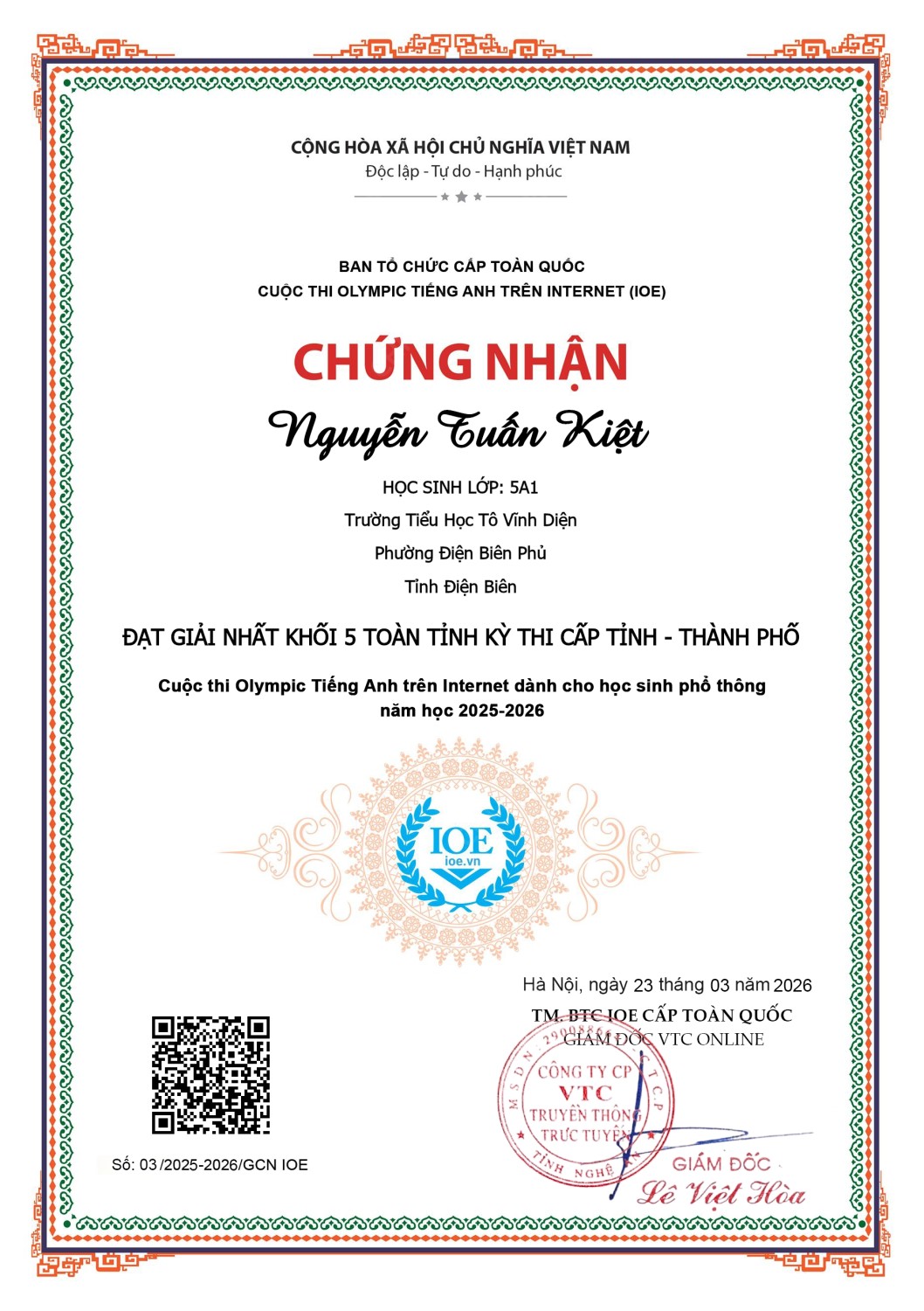 ✨ Với tinh thần học tập nghiêm túc, bản lĩnh và niềm đam mê tiếng Anh, các em học sinh Trường Tiểu học Tô Vĩnh Diện đã xuất sắc gặt hái những kết quả vô cùng tự hào trong cuộc thi Olympic Tiếng Anh trên Internet (IOE) cấp tỉnh năm học 2025–2026!