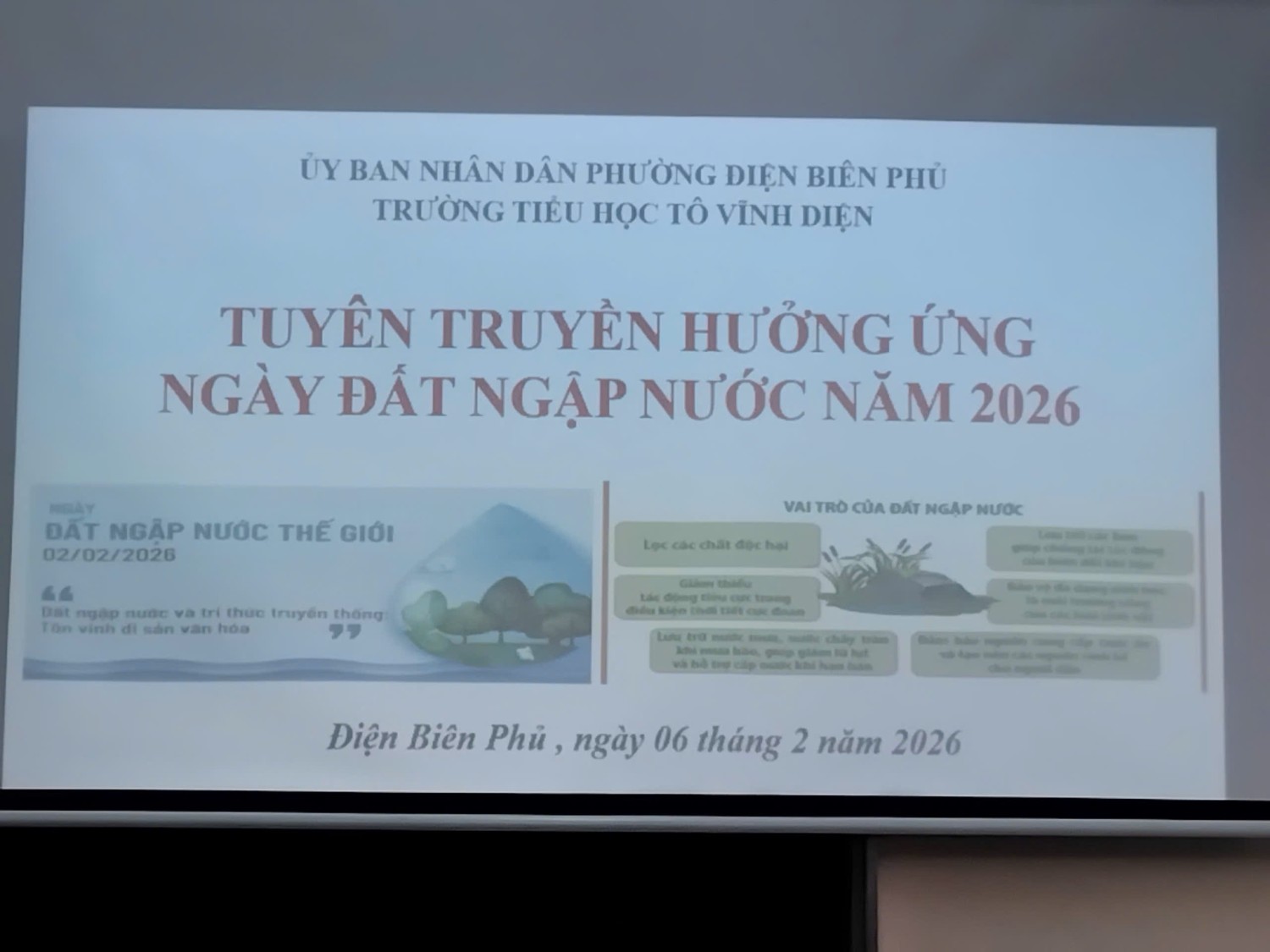 Thực hiện Kế hoạch số 265/SGDĐT-VP ngày 23/01/2026 của Sở Giáo dục và Đào tạo tỉnh Điện Biên về việc hưởng ứng Ngày Đất ngập nước Thế giới năm 2026.Trường Tiểu học Tô Vĩnh Diện xây dựng kế hoạch và tổ chức các hoạt động tuyên truyền nhằm nâng cao nhận thức cho cán bộ, giáo viên, nhân viên và học sinh về vai trò, ý nghĩa và tầm quan trọng của đất ngập nước đối với môi trường và đời sống con người.Ngày Đất ngập nước Thế giới được tổ chức hằng năm vào ngày 02 tháng 02, nhằm kỷ niệm sự kiện ký kết Công ước Ramsar – công ước quốc tế về bảo tồn và sử dụng hợp lý các vùng đất ngập nước. Đây là dịp để các quốc gia, các tổ chức và cộng đồng cùng chung tay nâng cao nhận thức, trách nhiệm trong việc bảo vệ các hệ sinh thái đất ngập nước.Đất ngập nước bao gồm các hệ sinh thái như sông, suối, ao, hồ, đầm lầy, ruộng nước… có vai trò quan trọng trong việc điều hòa khí hậu, bảo vệ nguồn nước, hạn chế thiên tai, bảo tồn đa dạng sinh học và góp phần phát triển bền vững. Tuy nhiên, hiện nay nhiều vùng đất ngập nước đang bị suy giảm diện tích và chất lượng do ô nhiễm môi trường, khai thác quá mức và tác động của biến đổi khí hậu.Thông qua hoạt động tuyên truyền hưởng ứng Ngày Đất ngập nước Thế giới năm 2026, Trường Tiểu học Tô Vĩnh Diện nhằm giáo dục học sinh ý thức bảo vệ môi trường ngay từ những hành động nhỏ, phù hợp với lứa tuổi như: giữ gìn vệ sinh nguồn nước, không xả rác bừa bãi, yêu quý và bảo vệ thiên nhiên xung quanh, tích cực tham gia các hoạt động bảo vệ môi trường do nhà trường và địa phương tổ chức.Việc hưởng ứng Ngày Đất ngập nước Thế giới là hoạt động thiết thực, góp phần thực hiện tốt công tác giáo dục môi trường trong nhà trường, đồng thời lan tỏa thông điệp bảo vệ đất ngập nước, bảo vệ môi trường sống vì sự phát triển bền vững hôm nay và mai sau.Mỗi cán bộ, giáo viên và học sinh Trường Tiểu học Tô Vĩnh Diện hãy cùng chung tay hành động vì môi trường xanh – sạch – đẹp!