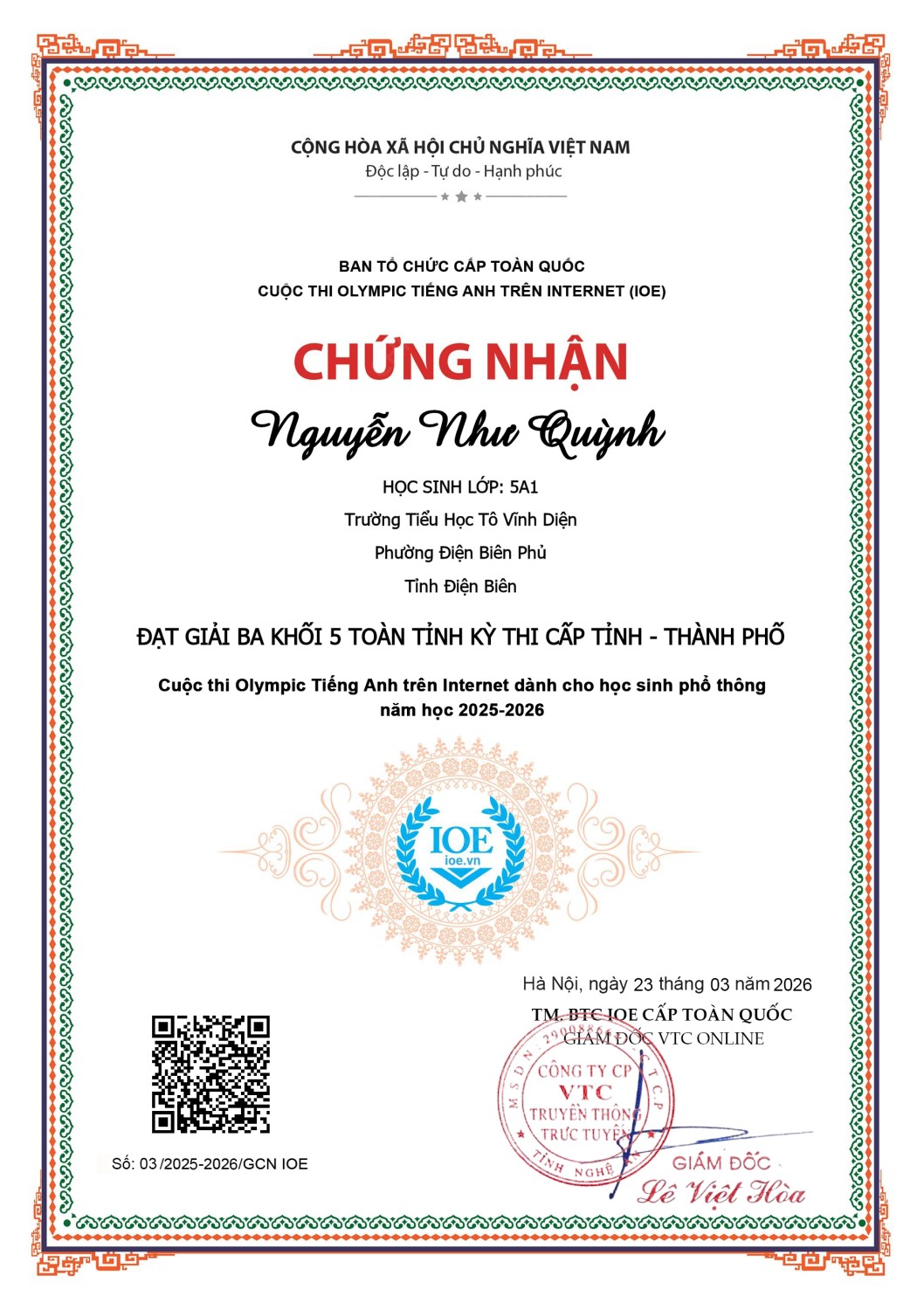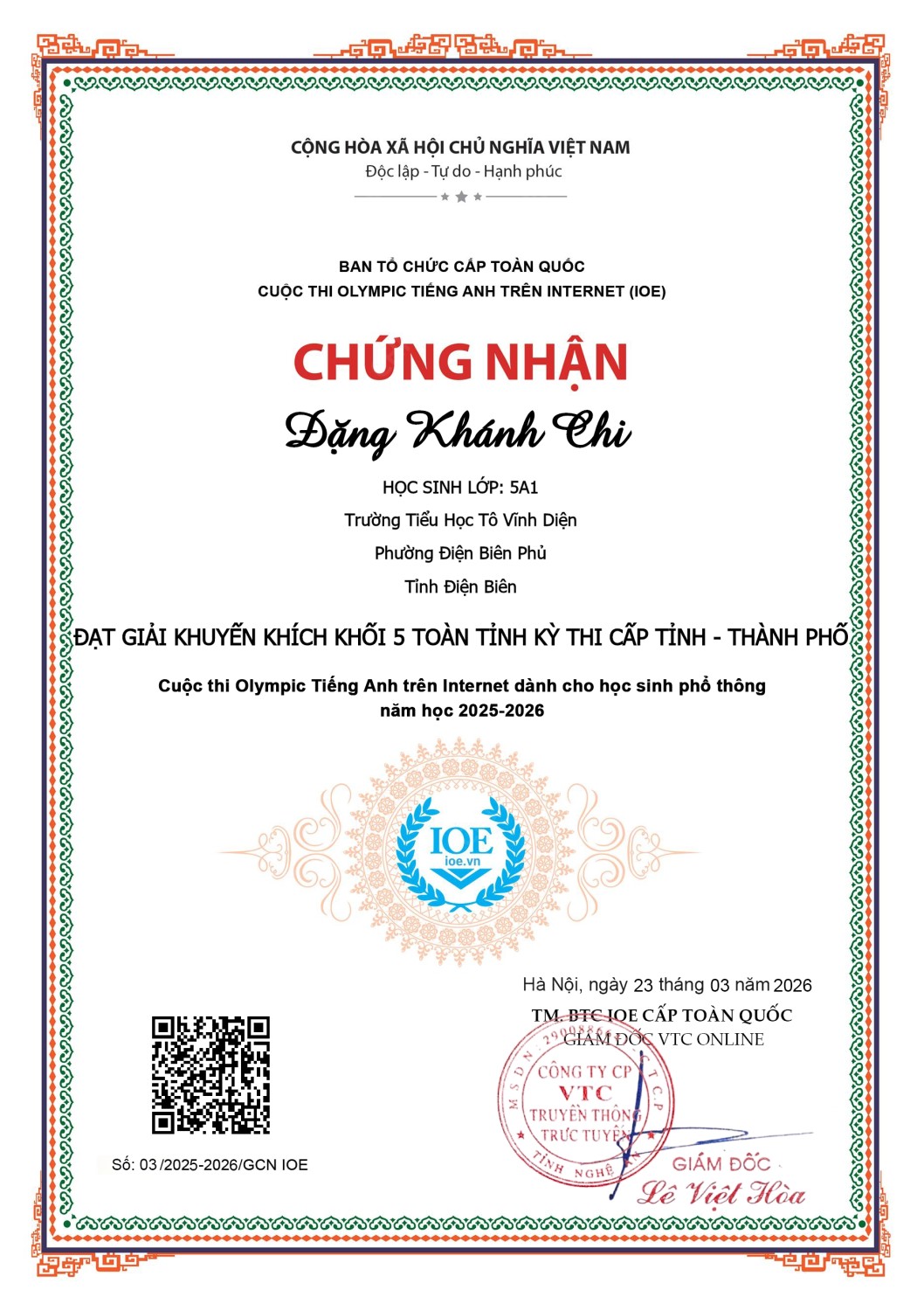 ✨ Với tinh thần học tập nghiêm túc, bản lĩnh và niềm đam mê tiếng Anh, các em học sinh Trường Tiểu học Tô Vĩnh Diện đã xuất sắc gặt hái những kết quả vô cùng tự hào trong cuộc thi Olympic Tiếng Anh trên Internet (IOE) cấp tỉnh năm học 2025–2026!