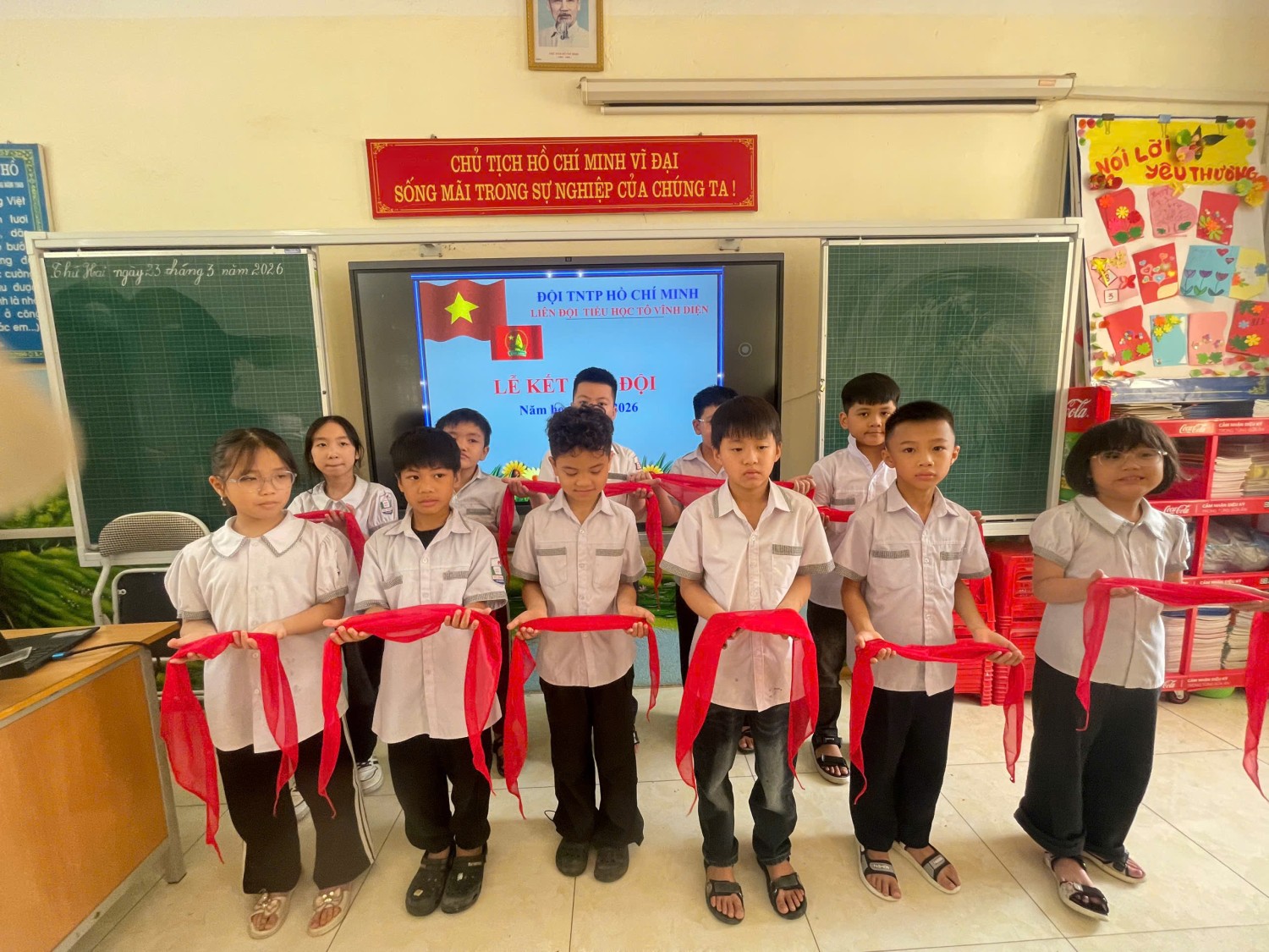 Tiếp đó, Liên đội nhà trường đã tổ chức lễ kết nạp đội viên đợt 2 cho các em nhi đồng đủ điều kiện. Đây là dấu mốc quan trọng, giúp các em thêm tự hào khi được đứng trong hàng ngũ Đội TNTP Hồ Chí Minh, từ đó phấn đấu rèn luyện, học tập tốt hơn.